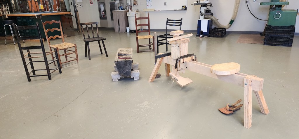 So why are we in the 17th century? Sure the art of spindle turning was invented in the 17th century. One of the handcrafted chairs in the above image has turned spindles. Most of the other chairs have hand drawn spindles. The bench in the foreground is what is used to shape the spindles and other parts with the draw knife shown. The wood is split by hand with wedges on the log that is in front of the chairs. These individually hand crafted wood chairs are made in the wood shop. The priority here is given to the feel of the cutting tool.